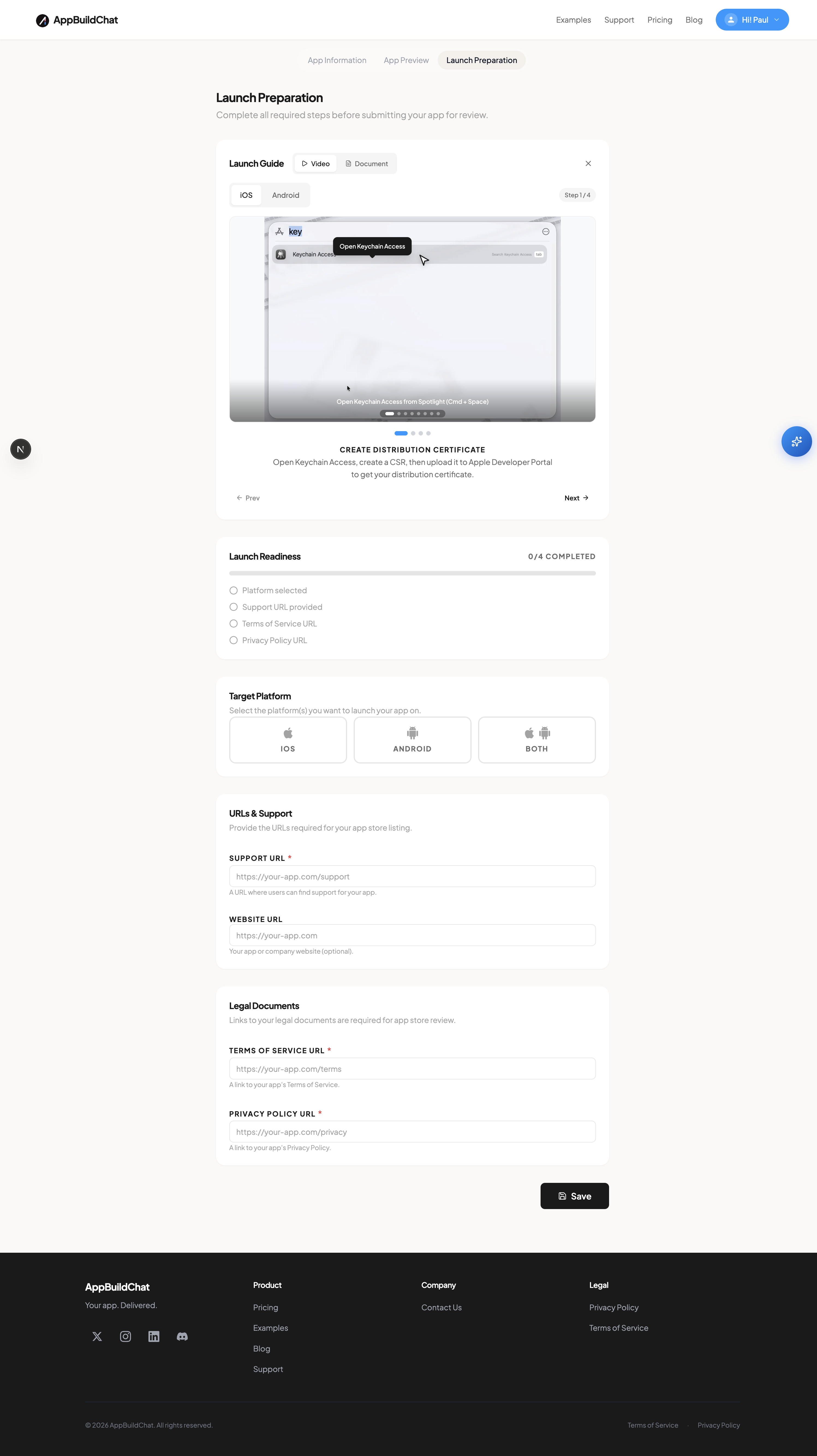 The Launch Preparation tab walks you step by step through everything needed to submit your app to the App Store and Play Store. Follow the checklist to make sure nothing is missed before launch.